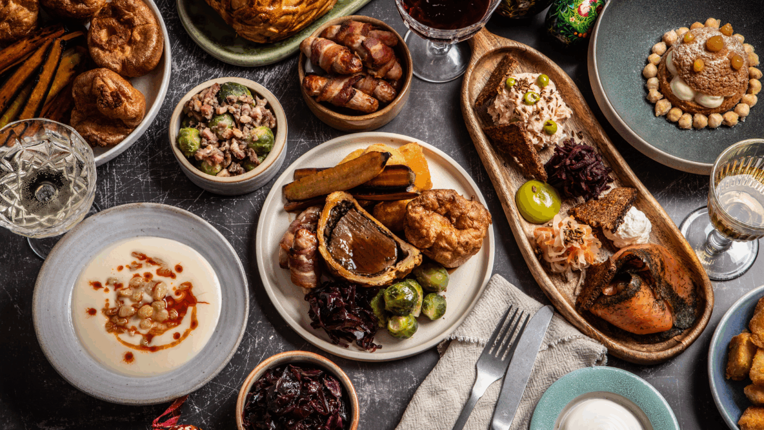 Starts with a delicious cauliflower amuse-bouche, followed by a fresh gravadlax and crab starter. For the main event: Turkey Wellington, accompanied by Yorkshire puddings, pigs in blankets, roast potatoes and more trimmings. The menu finishes with a choux bun filled with Christmas cake parfait with Douglas fir sherbet.