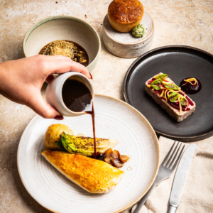 A decadent vegetarian dinner party feast. Begin with Douglas fir nuts and truffle-laced canapés, then enjoy a seasonal carrot amuse-bouche, sourdough with burrata and mushroom parfait, and a beetroot starter. The centrepiece is a Tunworth & potato Wellington with indulgent sides, followed by a chocolate fondant dessert, petit fours and paired wines.