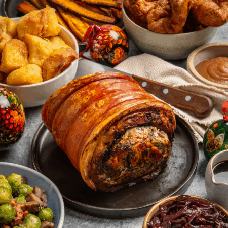Designed for sharing, this feast brings everyone together around the table. A whole Yorkshire porchette, rolled with sage and herbs, is the star of the show, served alongside duck fast roast potatoes, braised red cabbage, bacon & chestnut sprouts, Yorkshire puddings, bread sauce and apple butter. Finished with a rich red wine jus, it’s a festive spread guaranteed to please the whole family. Delivered on Tuesday 23rd December.