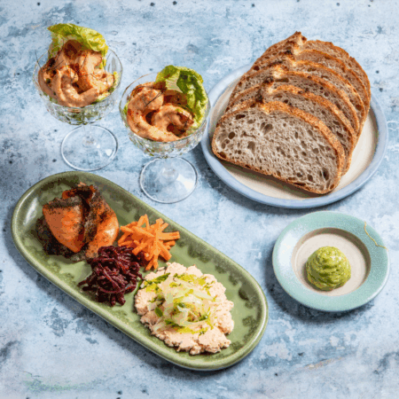 Bring a taste of the sea to your festive table. This indulgent platter includes gravadlax salmon, crab pâté, prawn cocktail, caviar, pickles and Hopical Storm slaw, served with sourdough and herb butter. Enjoy between two as a meal or between four as a show-stopping starter. Delivered on Tuesday 23rd December.