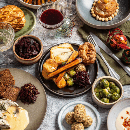 A festive celebration without compromise. The Christmas vegetarian menu begins with a velvety cauliflower soup topped with cider-soaked raisins, followed by a Winslade cheese sharing starter with beetroot and dill. The centrepiece is a golden Tunworth & Truffle Wellington served with Yorkshire puddings, braised cabbage, sprouts, roast potatoes and more. Dessert is a show-stopping Christmas cake choux bun finished with white chocolate and plum.