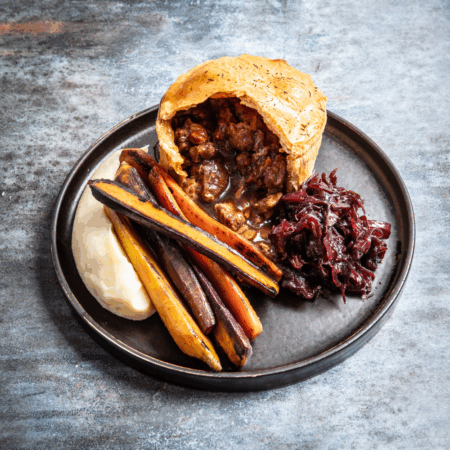 The perfect December night-in. This one-course meal includes two hearty steak and stout pies, smoked butter mash, braised red cabbage, heritage carrots and beef gravy. Easy to heat and enjoy, it’s everything you want from comforting winter food – rich, warming and satisfying.