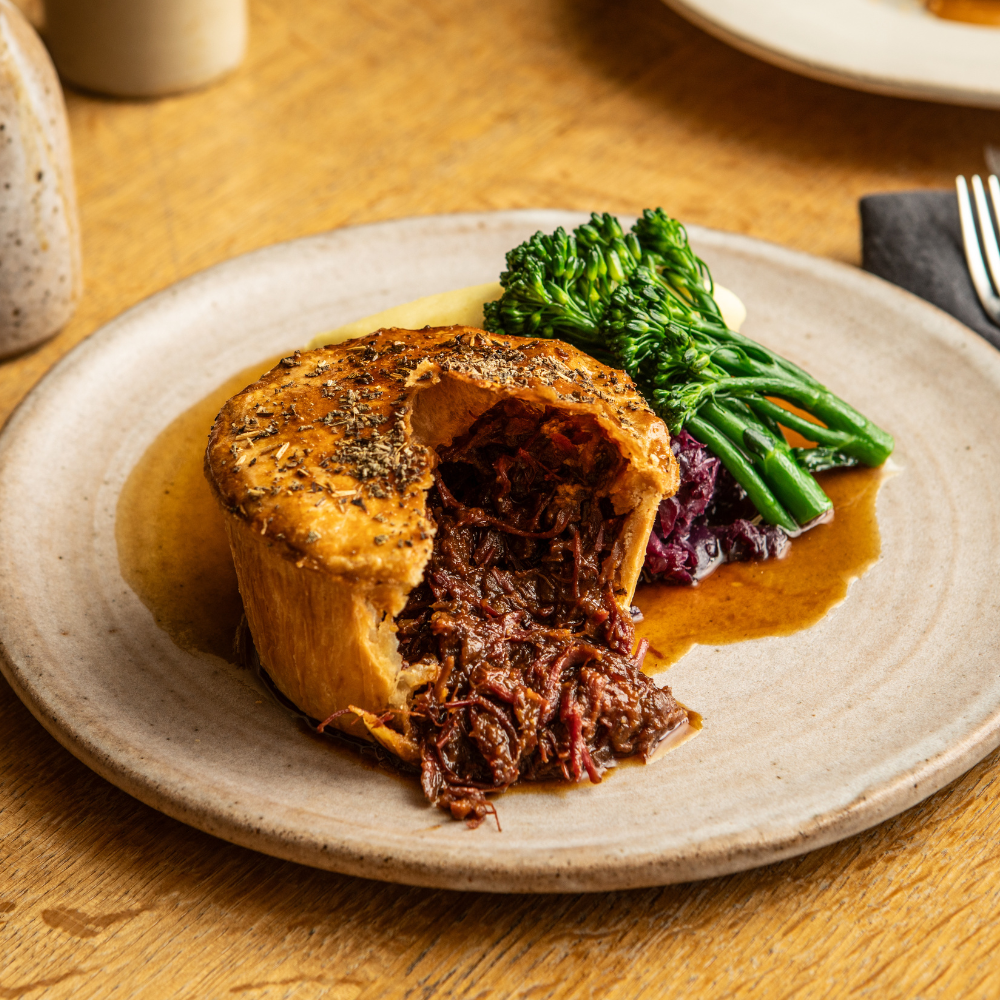 Beef & blue cheese pie with smoked butter mashed potato, braised red cabbage, Tenderstem broccoli and red wine jus.