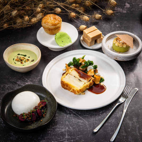 Tunworth & truffle Wellington accompanied by accompanied by roasted artichoke, caramelised artichoke purée, pickled artichokes discs, garlic kale, artichoke crisps, chive oil, and finished with a rich mushroom jus.