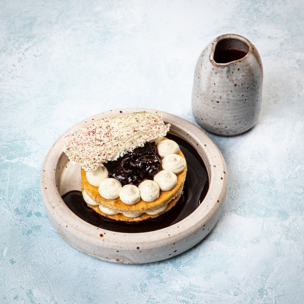 Mascarpone sponge layered with whipped lemon verbena cream and blackcurrant compote, topped with a blackcurrant and lemon verbena meringue and finished with a delicate blackcurrant and lemon verbena consommé.