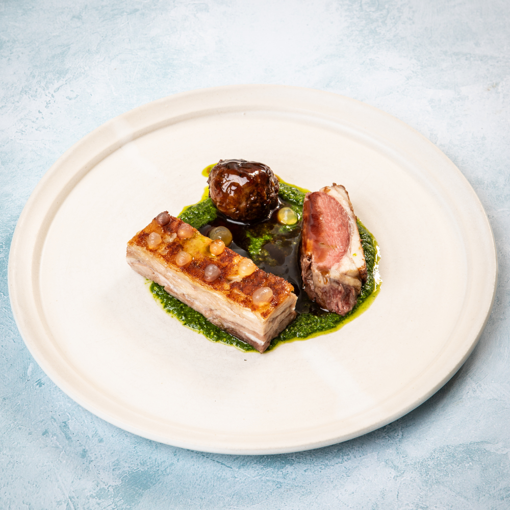 Roasted Yorkshire lamb rump and lamb belly accompanied by a lamb & mint faggot, mint vinegar gel, garden herb pesto and basil oil.