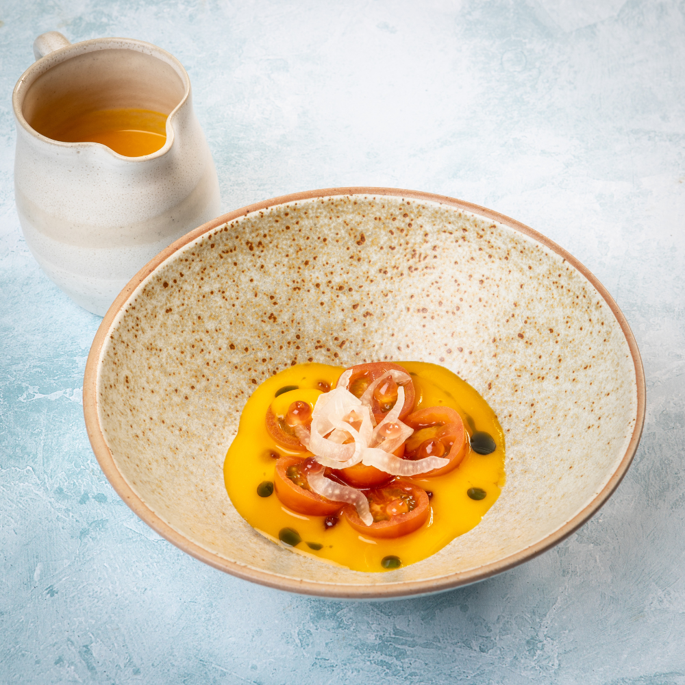 Chilled Sungold soup with macerated cherry tomatoes and pickled fennel. Topped with fennel pollen vinegar gel and nasturtium oil.