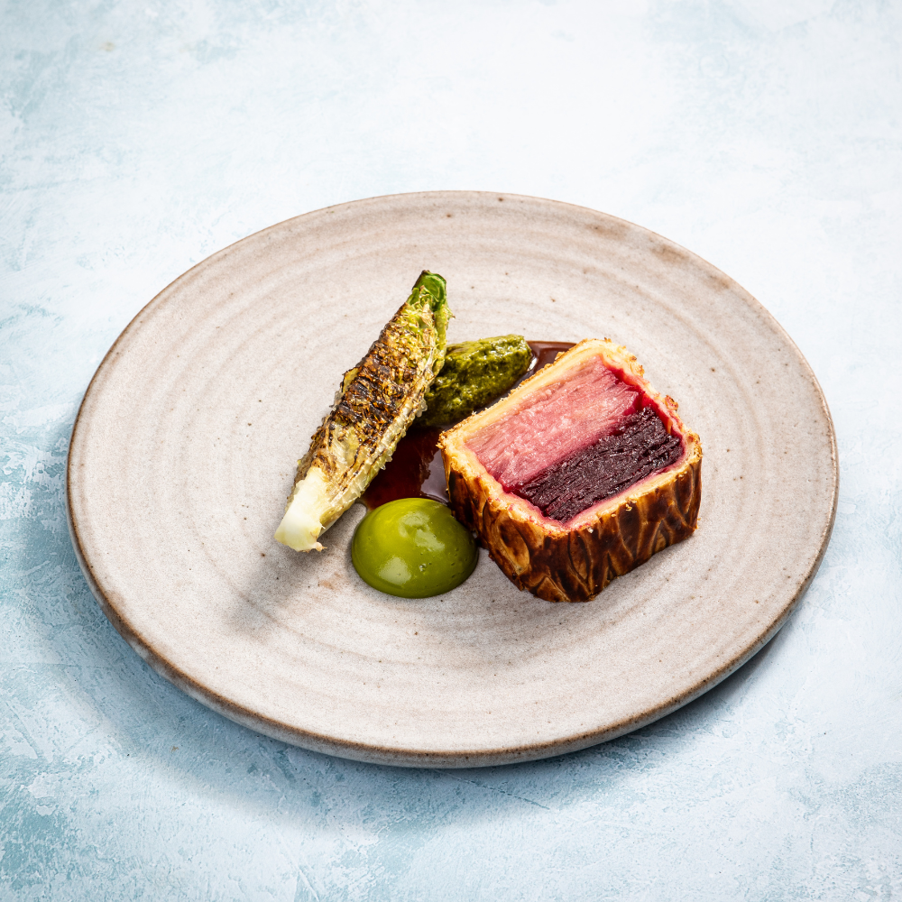 At the centre of the main course: Beetroot Wellington accompanied by charred baby gem lettuce. Topped with a kitchen garden herb emulsion, salsa verde, elderflower vinegar gel and finished with a rich mushroom jus.