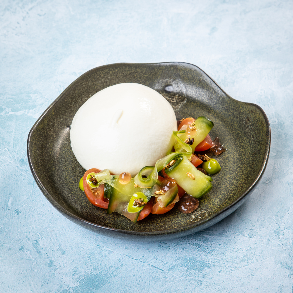 Creamy burrata and lemon verbena & honey macerated tomatoes, served with toasted sunflower seeds, fennel pollen vinegar gel, basil emulsion and pickled cucumber slices.